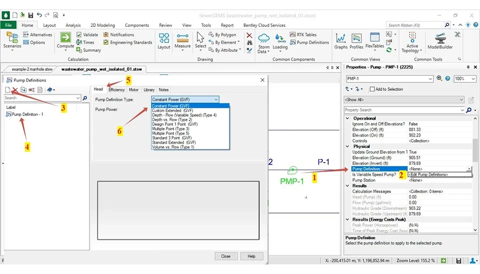 There are some methods to import the information of the pump for the lift station. One of them imports a pump based on the flow rate and head; to learn this method, it was done in the Design and Analysis of Water Distribution Network Using WaterGEMS that goes to the following (part 4.8).