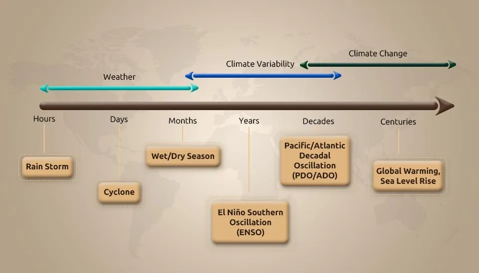The dependency of ecosystems, the Earth system, and human society on precipitation is crucial (Kidd et al. 2017). The socioeconomic impacts of extreme precipitation events caused by blizzards, hurricanes, droughts, floods, and landslides are significant (NRC, 2010). Climate variability, on a global and regional scale, is heavily impacted by precipitation, clouds, and water vapour mass exchanges (Ramanathan et al., 2001). The temporal dimensions of weather and climate phenomena are very wide and include various phenomena that are shown in Figure 2.