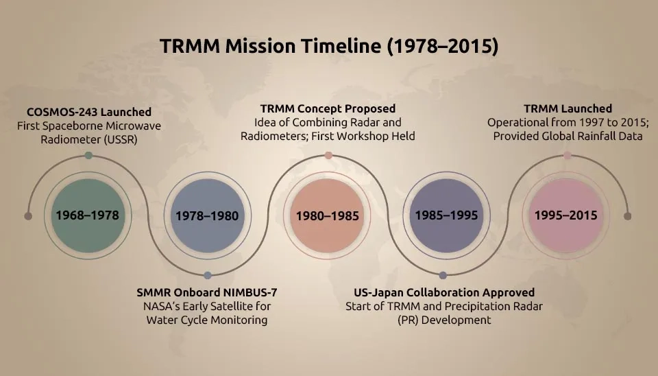 Meteorologists have studied rainfall patterns over the land for decades using ground-based radar, specialized aircraft instruments, and weather ground stations. Satellites provide exceptional measurements over the Earth, whereas standard ground-based instruments lack visibility. We describe the history of the first spaceborne TRMM as follows: