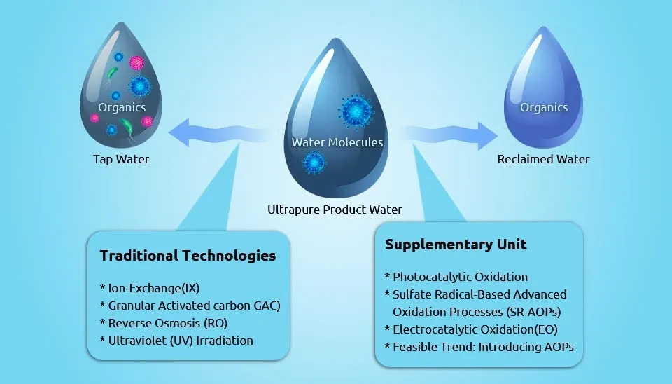 Studies have shown that UV irradiation (185 nm) is effective in removing and deactivating some low molecular weight organic matters like isopropanol, methanol, and pathogens. In addition, Ultrafiltration (UF) technology is an efficient method for suspended microorganisms degradation. Moreover, RO, UV irradiation, and IX adsorption can remove dissolved macro molecular organic and inorganic pollutants (Sun and Chen, 2014; Matilainen and Sillanpää, 2010).