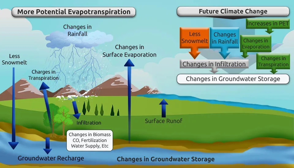 Floods and droughts are extreme events whose frequency have been increased due to climate change impacts. High-intensity rainfall and flood occurrence contribute to groundwater pollution by surface contaminants. Also, drought events and increasing evaporation, the other consequences of climate change, can reduce the volume of surface resources that recharge the groundwater. Apart from floods and droughts, whose share is more than 60% among water-related natural disasters, Other natural events such as volcanic eruptions, earthquakes, tornadoes, and tsunamis can also cause pollutants to enter the groundwater (Akhtar et al., 2021).
