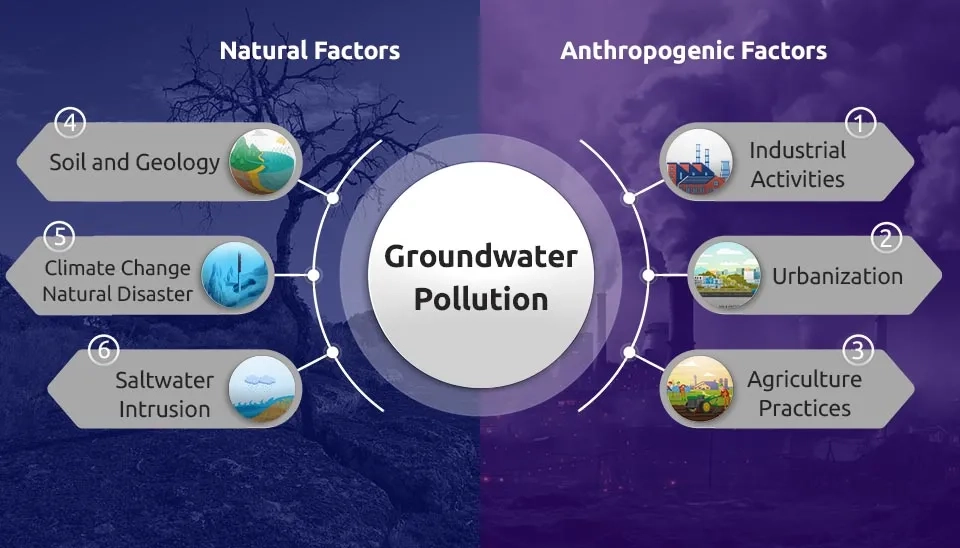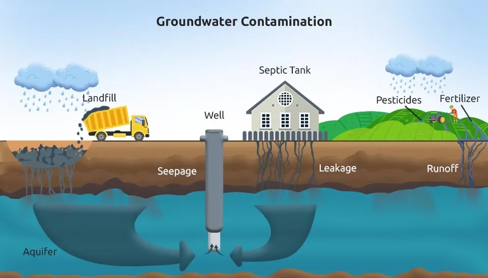 Humans, in their efforts to meet development needs and address growing demands, engage in a variety of industrial, agricultural, and urban activities. Their activities—whether intentional or unintentional—have a profound impact on water resources by introducing a wide range of pollutants into the environment. In agricultural areas, the use of fertilizers, pesticides, and irrigation systems leads to the leaching of chemicals into groundwater and contaminating it over time. Urban areas contaminate through waste discharge, leakage from sewage systems, and the accumulation of surface pollutants that ultimately infiltrate underground aquifers. Industrial activities compound the issue by discharging untreated, inadequately treated, and toxic chemicals, which directly affect the quality of water bodies and groundwater. In the sections that follow, these three major factors—agriculture, urban development, and industrial activities—will be examined in greater depth to understand their individual and combined impacts on groundwater resources.