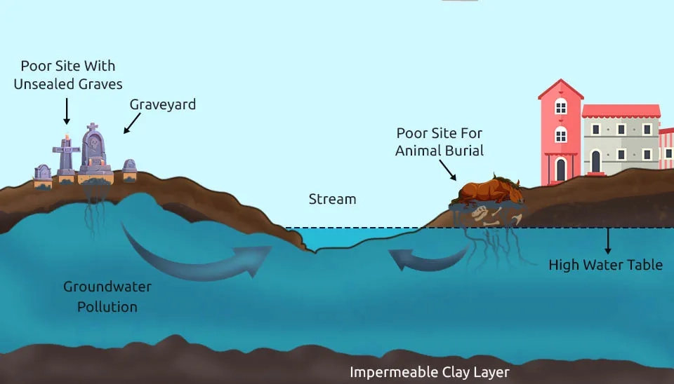 The wastewater from our daily activities, which is also known as grey water or black water, as well as wastewater from shops, restaurants, schools, offices, and medical centers, enter the wastewater collection systems. This effluent can contaminate groundwater sources in case of any leakage from pipes and septic tanks. In addition, fuel storage tanks, gas stations, garbage disposal centers, and landfills can also be other polluting sources in cities. Water pollution by graveyards is also an issue that should be considered because many of them are located in places that are connected to groundwater. During the process of human decomposition, an amount of 0.4 to 0.6 liters per 1 kg of leachate is produced and enters the soil. Leachate includes 10% organic compound, 30% salts in nitrogen ions, phosphorus, Cl, Na, and various metal compounds (Cr, Cd, Pb, Fe, Mn, Ni), and 30% water and has high conductivity, pH, and BOD value (Zychowski and Bryndal, 2014; Khatry and Tyagi, 2014).