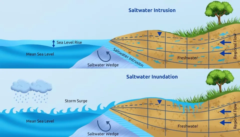 Did you know that over 1 million people in coastal areas rely on groundwater for freshwater? (Han and Currell, 2022) Learn more about why groundwater is crucial for coastal communities. Groundwater is exposed to saltwater intrusion due to its interface with seawater. When the groundwater level exceeds the sea level, water movement towards the sea prevents salt water from entering the aquifer. However, due to natural events such as storm surges, coastal floods, hurricanes, tsunamis, subsidence, and climate changes, the sea level may be higher than the aquifer level and cause saltwater intrusion. Of course, this phenomenon may also occur due to groundwater overexploitation and lowering its level (Basack et al., 2022).