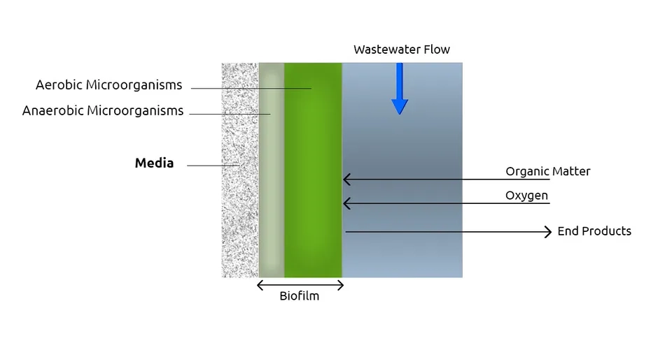 Wastewater treatment in the TF process is based on the formation of a biofilm layer attached to the surface of the support medium. The support medium consists of highly porous materials that supply a large surface area for the growth of microorganisms and form a thin biofilm layer (Gangaraju et al., 2021). The thickness of this microbial layer is approximately 0.1-0.2 mm, and it consists of aerobic heterotrophic microorganisms that can decompose BOD, Chemical Oxygen Demand (COD), and ammonia. These microorganisms break down the organic pollutants when wastewater is distributed on the support media and comes into contact with the biofilm layer as it flows down the packed bed. The microbial layer gets thicker over time as a result of the growth of microorganisms, and when the thickness reaches a certain point, oxygen can not fully diffuse into the slime layer, which leads to the formation of an anaerobic condition near the surface of the media. When the biofilm layer reaches the critical point, microorganisms near the surface of the media do not receive any organic carbon. Thus, their ability to attach to the surface is weakened, the biofilm layer gets washed off, and a new layer forms (Pilco et al., 2023; Vayenas, 2011). This process is known as sloughing. Sloughed biofilms are then eliminated in a settling tank (Oakley and Sperling, 2018). Two main mechanisms that are used for removing contaminants from biofilms are adsorption and absorption. To maintain the aerobic growth of microorganisms, oxygen is needed, and it can be provided through a natural air draft or forced aeration (Yahya et al., 2020).