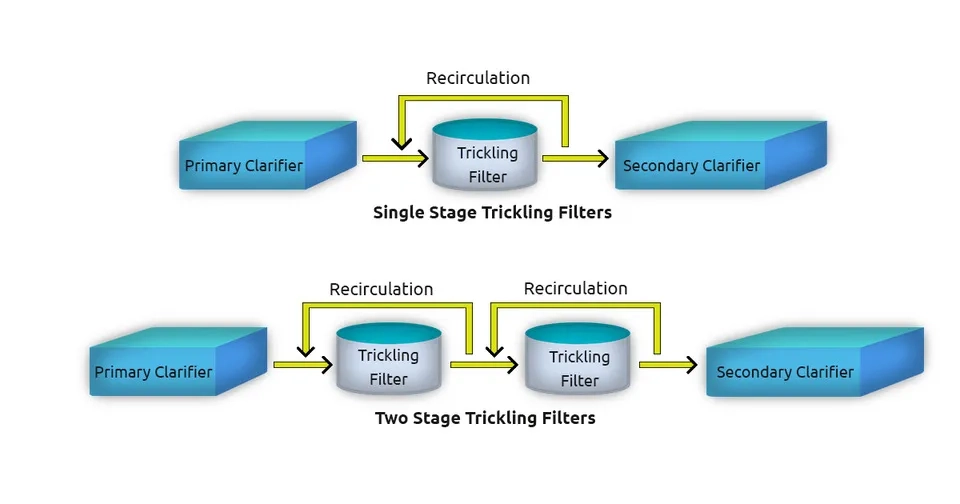 Trickling filters can also operate in a single-stage or two-stage. Two-stage treatment results in better BOD removal and nitrification. In this system, two filters are placed consecutively, and the effluent of the first filter flows into the second filter (Arous et al., 2022).