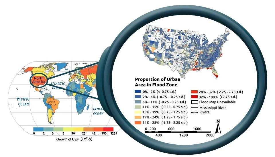 Do you believe that 92,233 square kilometers of global urban areas are at risk of urban flooding? Look at Figure 1. About 25 million people of the US population (about 8.3% of the total population) live in areas that are prone to flooding. As shown in Figure 1, urban areas located in coastal areas (especially in the southeastern United States) have a greater risk of urban flooding. The challenge of urban flooding is not limited to the United States; it covers many urban areas around the world (Qiang et al., 2017). The long-term study of flood-prone urban areas shows that, in recent decades, urban areas are more and more at risk of flooding. The flood-prone urban areas reached 92.2 million square kilometers in 2018, up from 16.4 million square kilometers in 1985. In other words, 2.3 million square kilometers are added to flood-prone urban areas every year. The increase in flood-prone urban areas on the continents of Asia, Europe, and North America had the largest share of 74.1%, 11.6%, and 8.7%, respectively. Among the countries, China and America account for 61.5% of urban areas that are prone to flooding (Cao et al., 2022). Considering that the major increase in flood-prone urban areas in recent decades has been accompanied by climate change and the growth of urban areas in high-risk regions, it is expected that urban areas will be at risk of flooding in the coming decades. Therefore, it is necessary to adopt sustainable approaches to deal with the risk of urban flooding, which requires urban flood modeling.