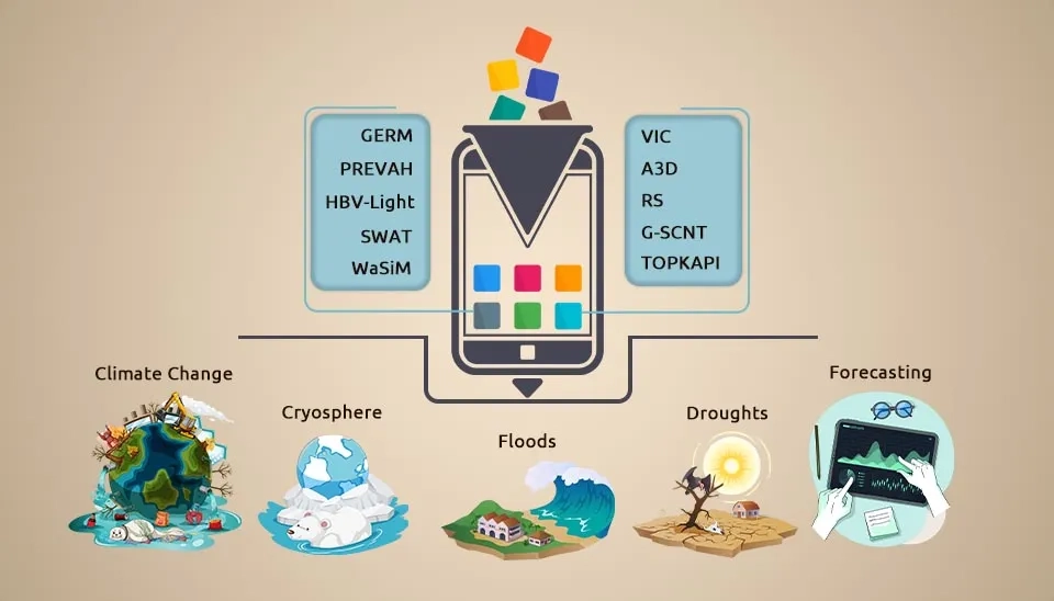 Apart from the USGS-developed models, several other notable hydrological modeling software tools are available in the market. Other hydrologic models that help with water resources comprehension, forecasting, and management include HEC-HMS (flash flood risk assessment) (Mandal and Chakrabarty, 2016); SCS-CN (Soil Conservation Service Curve Number) (Sahu et al., 2023); SWAT (Soil and Water Assessment Tool) (Arnold et al., 2012); MODSIM (a Decision Support System for Integrated River Basin Management) (Berhe et al., 2013); GERM (Glacier Evolution Runoff Mode); HYPE (Hydrological Predictions for the Environment); PREVAH (Precipitation–Runoff–Evapotranspiration HRU Model); and VIC (Variable Infiltration Capacity model) (Horton et al., 2021; Wi et al., 2017).
