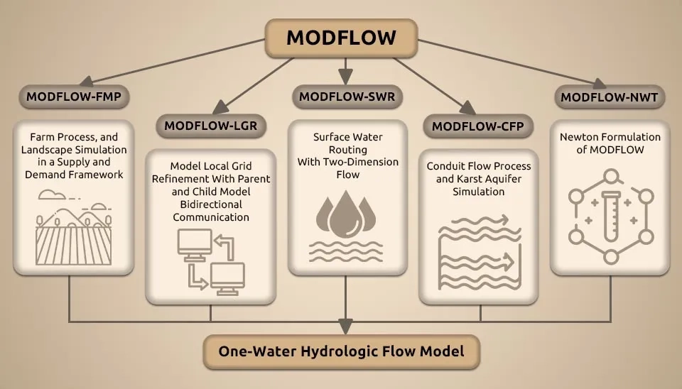 The U.S. Geological Survey (USGS) has been at the forefront of hydrological modeling software development since the 1960s. Their models are widely used to predict the responses of hydrological systems to changing stresses and assess the movement of solutes and contaminants in water (USGS, 2018). Many approaches to hydrologic modeling have been developed. In the following, five key software programs for hydrologic modeling are introduced.
