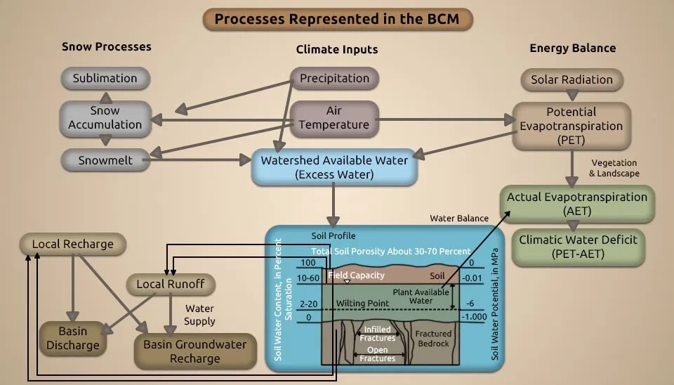 The Basin Characterization Model (BCM) is a regional water balance model that has been applied to numerous watersheds at a fine scale of 270 m grid cells to assess the impacts of climate change on both water availability and ecosystems. The BCM calculates water balance components, including runoff, recharge, evapotranspiration, soil moisture, and stream flow, based on climate, topography, soils and underlying geology, and the solar-driven energy balance. This map‐based, mechanistic model focuses on the interactions between climate (rainfall and temperature) and landscape attributes (topography, soils, and underlying geology) to calculate the water balance of a given watershed (USGS, 2018).