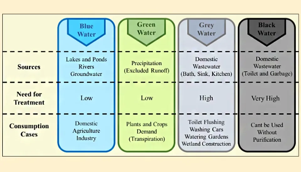 The lack of freshwater resources to meet human needs has caused agricultural and industrial development to be unsustainable and the use of non-renewable groundwater sources to surge. In the past two decades, attention to solutions such as increasing farm efficiency and preserving water resources, using unconventional water, and recycling water and wastewater techniques to supply the required water has been noticed by experts. To better understand these methods, one must first learn some key concepts in this field. In this article, we will examine different types of water color which includes green water, or the amount of water in the soil that can be accessed by plants, and water from domestic wastewater, which is classified as grey water or black water, depending on the level of contamination. Unlike blue water or surface and subsurface renewable resources, green, grey, and black water have received less attention. At the same time, knowing and understanding their importance makes it possible to minimize the consumption of blue water and contribute to a healthy and sustainable environment.