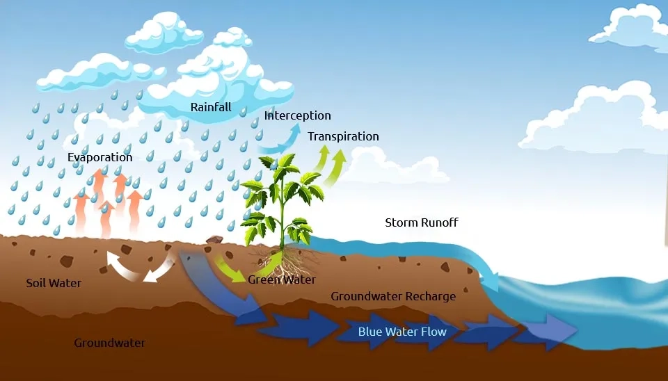 Green is another color of water that implies a part of the precipitation that has occurred on the terrestrial part of the earth and is stored by the soil and then used to meet the water demands of plants and finally released to the atmosphere by evaporation and transpiration is called green water (Hordofa et al., 2023). If this water joins the subsurface streams or joins the groundwater by deep percolation and is no longer accessible by the plant roots, then the term “green water” does not belong to it anymore, and it is considered blue water. So the green color has been chosen because this type of water is related to plants and crops, which are naturally green.