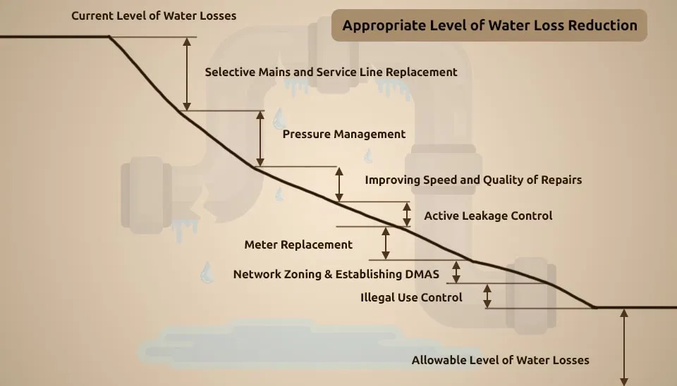 Determining the appropriate level of water loss reduction is a complex task for utilities. Leakage percentages and Infrastructure Leakage Indexes (ILIs) are often used as indicators, but they may not be suitable for all cases. Factors such as leakage levels and the costs of implementing leakage reduction methods influence the cost-benefit analysis. Setting realistic and optimal water loss targets requires considering a range of factors specific to each utility's circumstances and infrastructure (Audits, E. W. 2013; Kilinski, 2019 ; Ahopelto and Vahala, 2020).