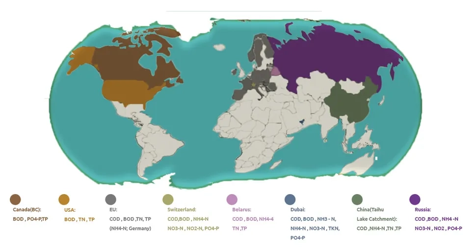 The pollution indicators incorporated in the legal regulations of certain locations are shown in the figure below. The comparison of these regulations revealed that, when it comes to mitigating eutrophication, the receiver-oriented policies applied, among others, in Switzerland and China, are the most sensible because they take socioeconomic aspects into account.