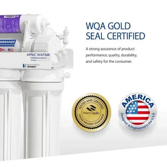 The APEC RO-PH90 is a top-tier reverse osmosis system that offers both high-capacity filtration and pH enhancement, providing ultra-pure, great-tasting, and balanced alkaline drinking water by removing up to 99% of contaminants. It utilizes 100% US-made high-purity calcium carbonate to safely raise pH. The system is built with super long-lasting US-made filters and comes with a premium designer faucet and a 4-gallon tank. Designed for durability, this system is expected to last for many years, and APEC offers lifetime support from WQA Certified Water Specialists. It is also available with an optional UV sterilization feature.