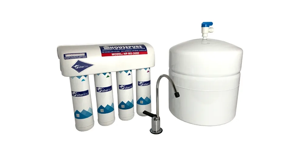 Details HousePure RO-3000 The finest in Reverse Osmosis is the HP-RO-3000. This system provides 21 gallons of truly purified water per day for you and your family. Designed to remove many impurities from your water, this system is the perfect choice for homes with salt-using water softeners, regions with specific water concerns like arsenic, and people who wish to reduce fluoride. System Includes: 4-cartrigde housing, storage tank & Chrome Air Gap Faucet PLUS a TDS meter to check your membrane’s performance annually CARTRIDGE HOUSING DIMENSIONS: 12.54” H / 14.57” W / 5.46 D STORAGE TANK DIMENSIONS: 14.61” H / 10.91” Diameter • Effortless with click-in lock cartridge installation. • Color coded cartridges maintains proper filter sequence. • Chrome air gap faucet included. • TDS meter included to check your membrane performance annually. • Upgrade products: we have decorative RO faucets and a multi-purpose air gap that are available in many finishes. • Add alkaline improvement with our HousePure Alkaline post filter.